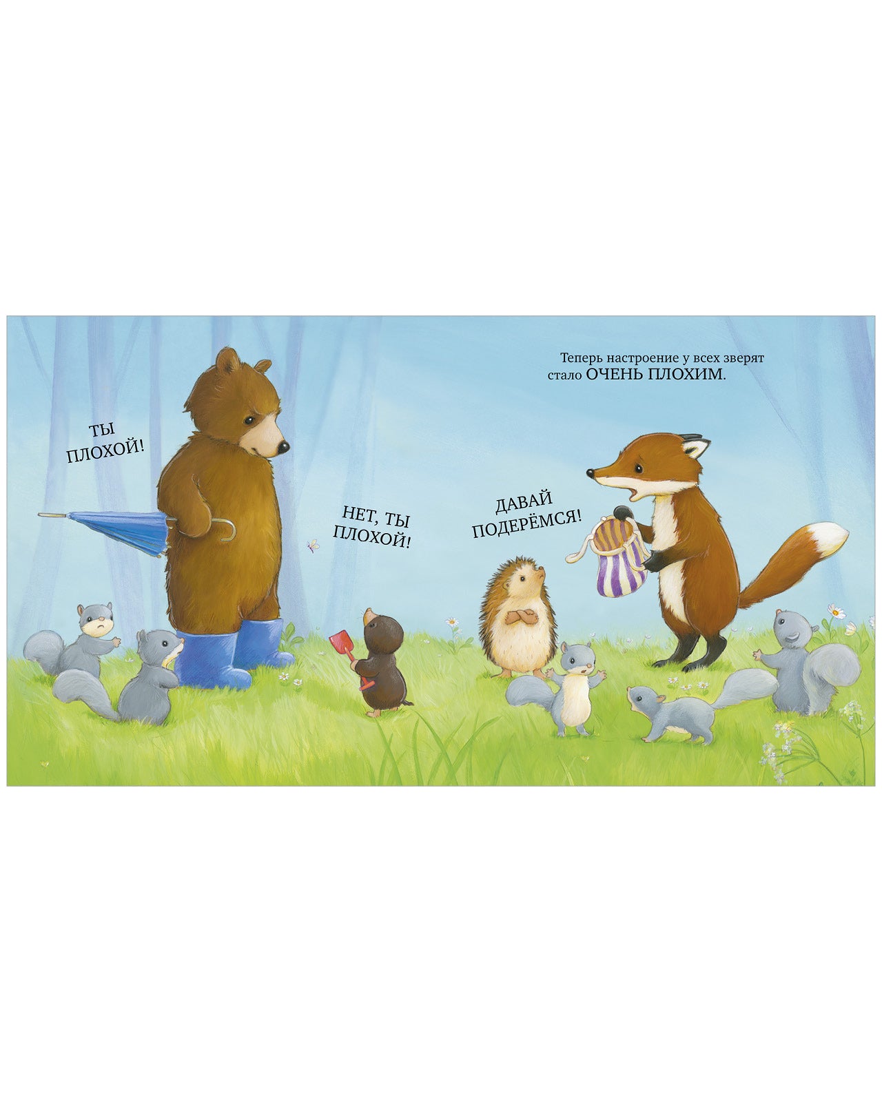 В лесу все были не в духе… Медвежонок шел и ворчал на неудобные сапоги, крот ворчал на медвежонка, который топал неудобными сапогами, ежик споткнулся о лопату крота и уколол лисичку, а та уронила покупки на бельчат. Тут уж сова рассердилась, что все шумят, и настроение у всех-всех-всех зверей стало плохим! Какое чудо поможет зверятам отыскать хорошее настроение и помириться?