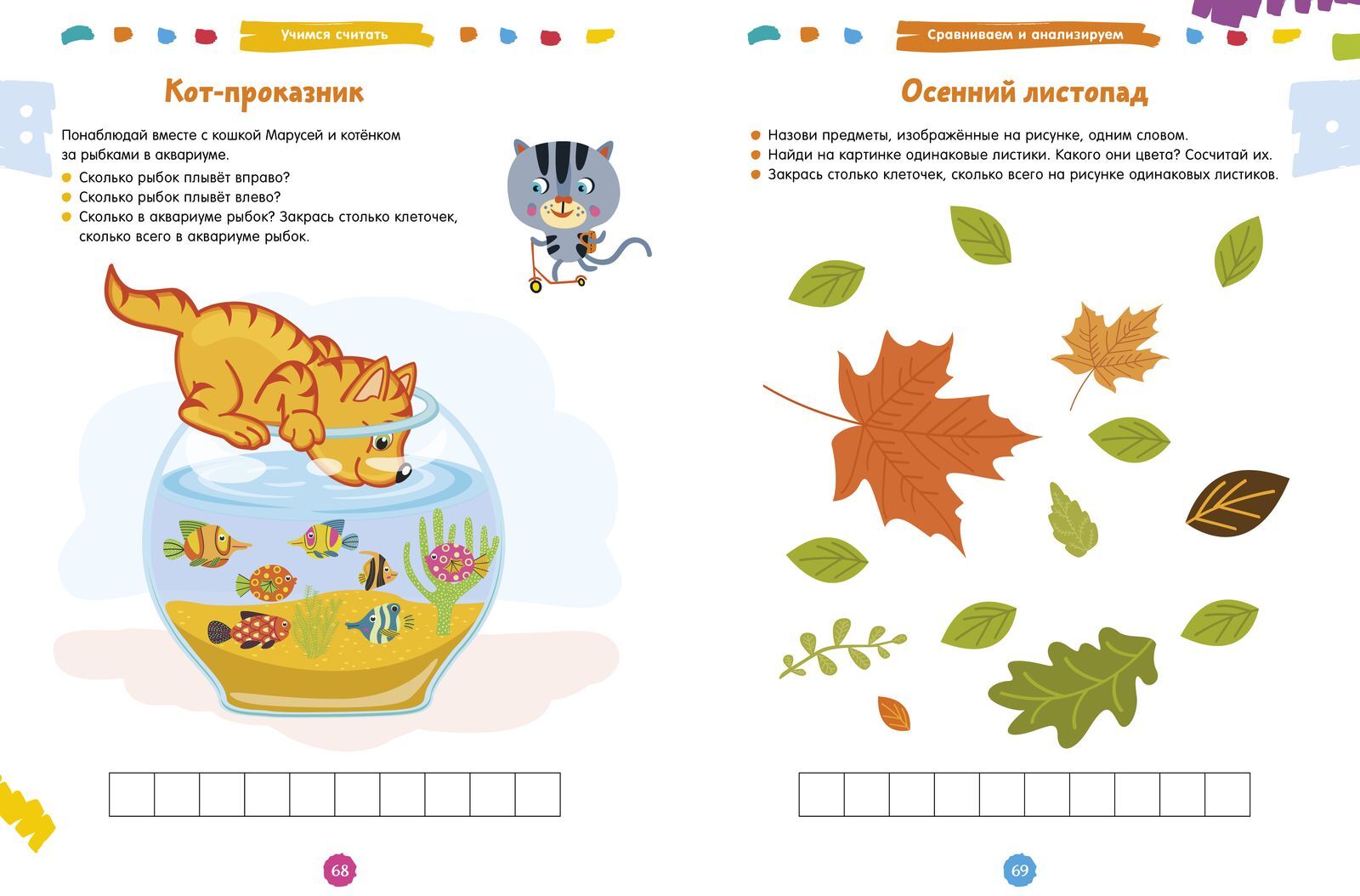 Задания очень разные, они специально подобраны таким образом, чтобы не перегрузить малыша и не дать ему заскучать.