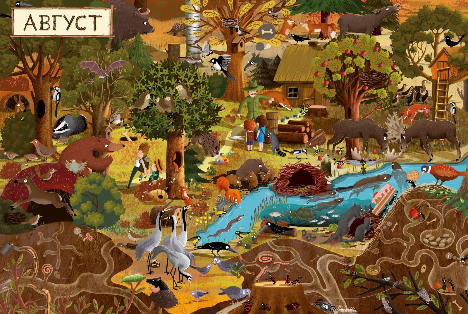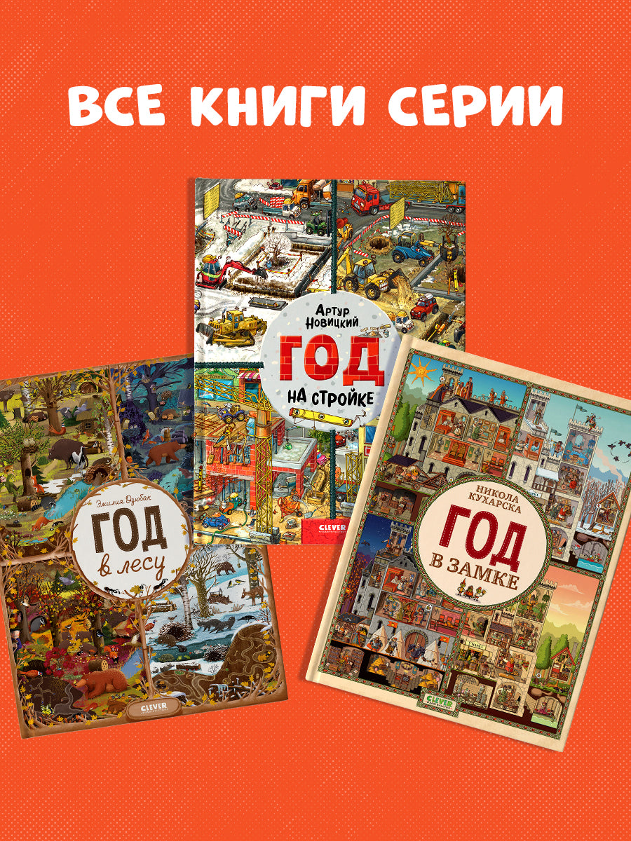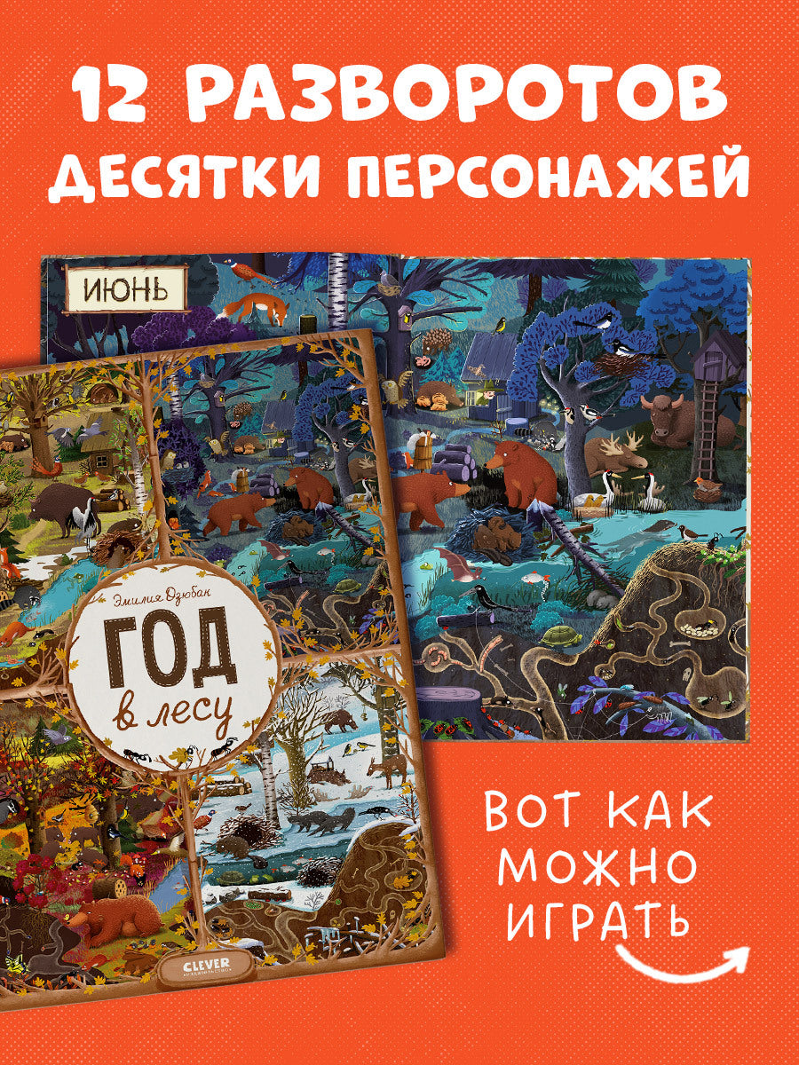 «Год в лесу» - это 12 разворотов, каждый из которых посвящён одному месяцу. Так вы сможете наблюдать за жизнью лесных жителей в любо время года, днём и ночью, познакомиться с повадками животных.