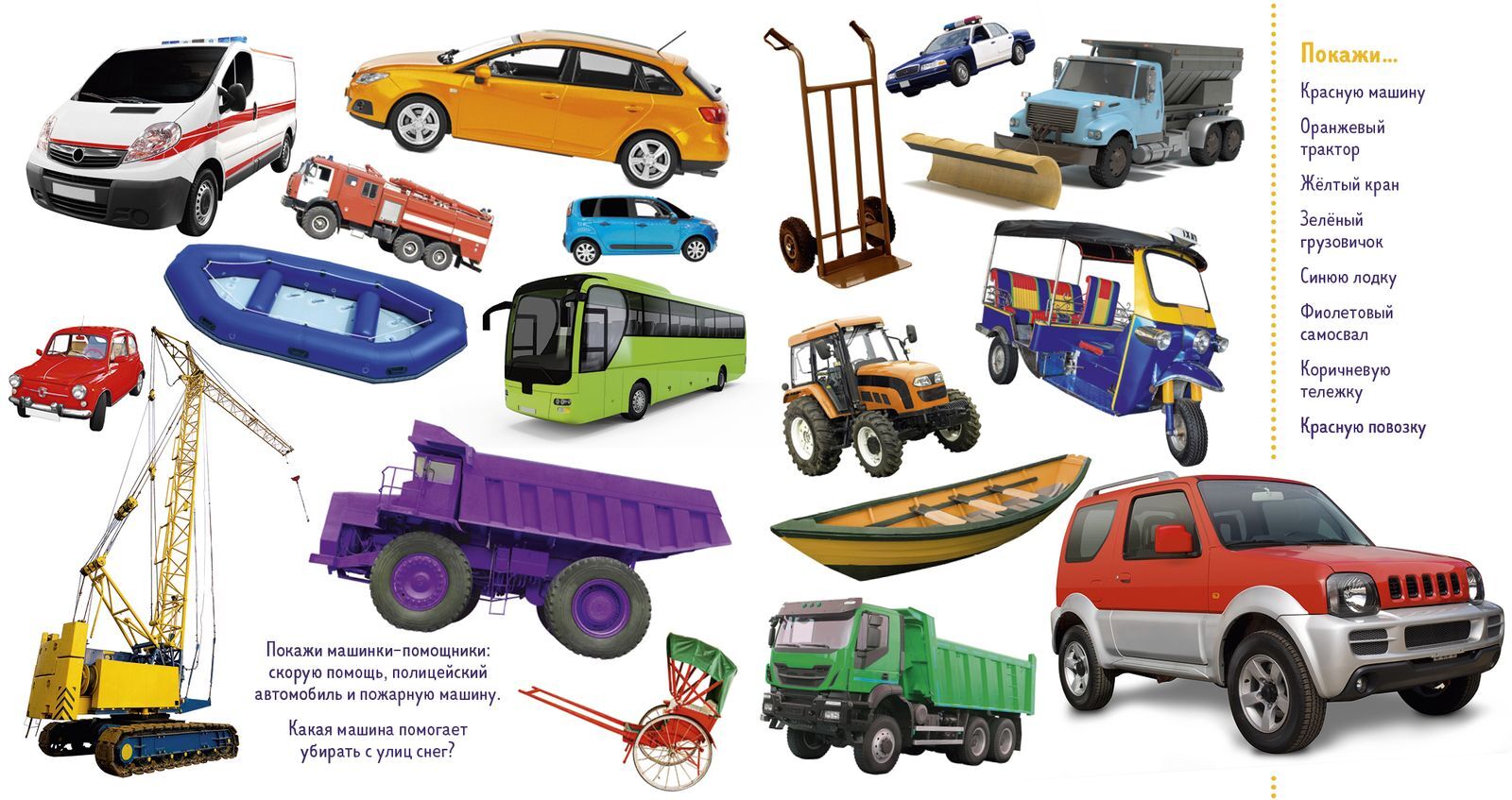 Машины и подъёмные краны, корабли бульдозеры и вертолёты! На страницах этой удивительной книжки-игры можно найти любой вид транспорта и неважно — ездит он, летает или плавает.