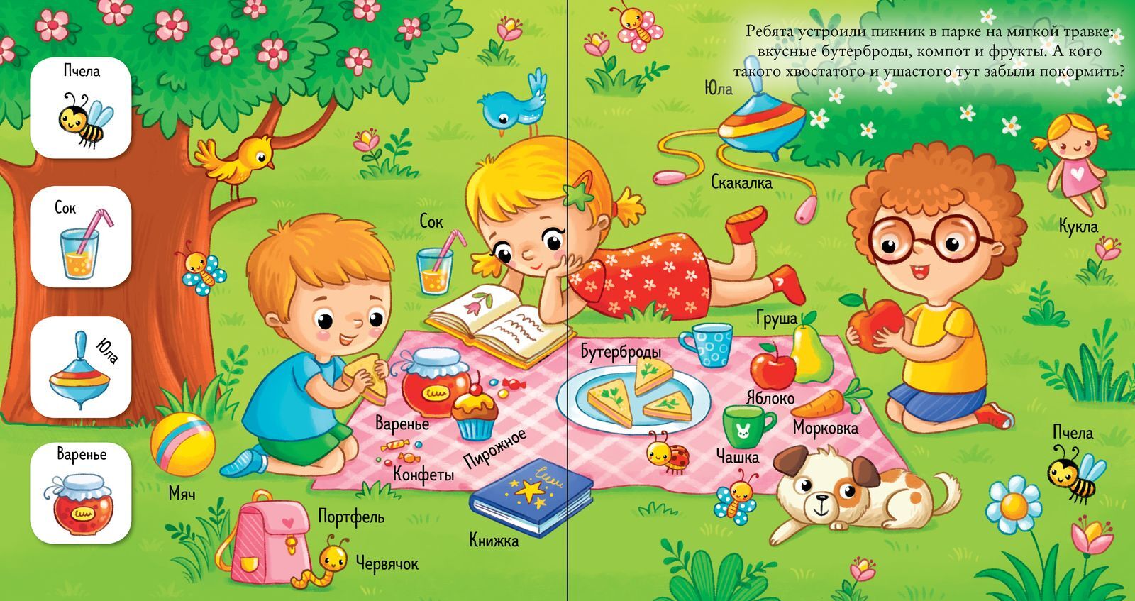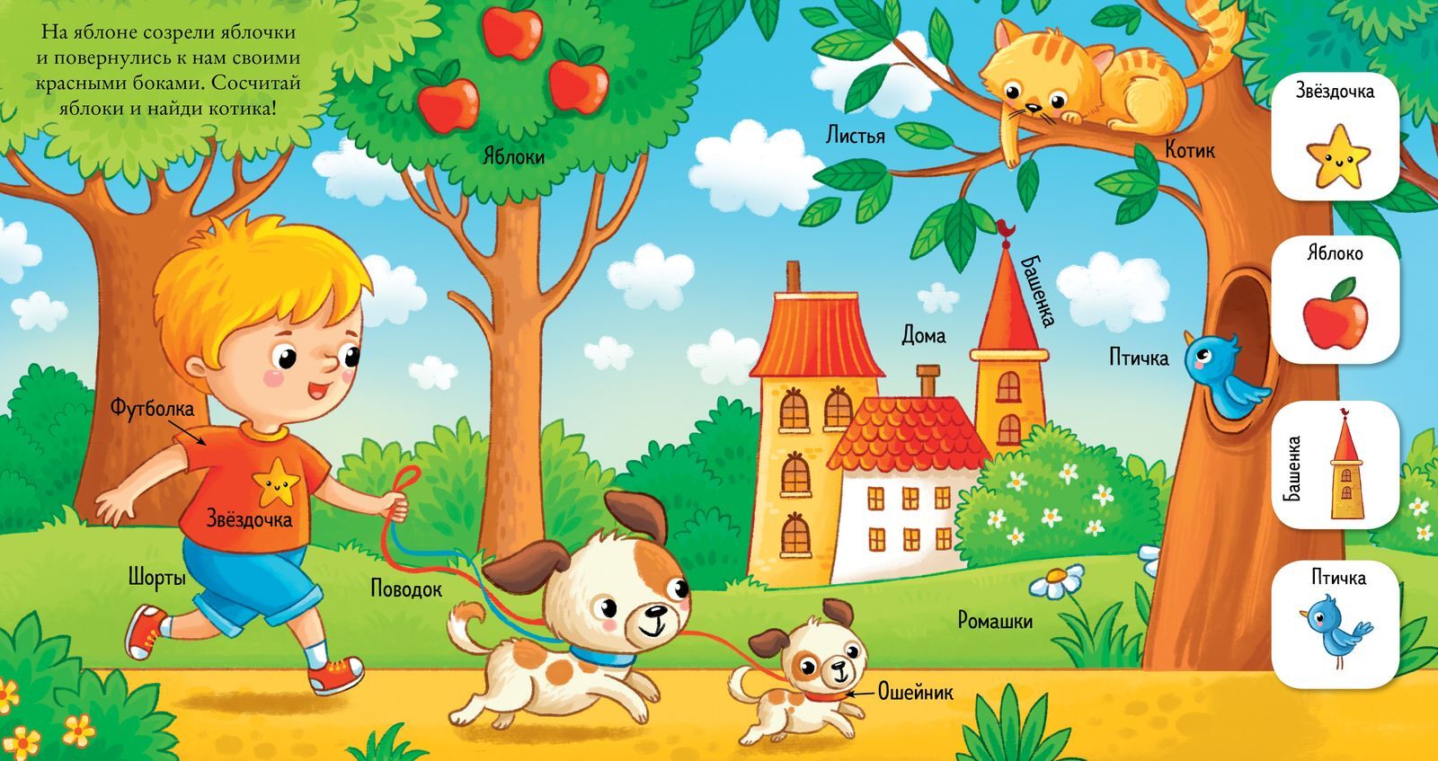 Каждая страница — это целый мир, в котором нужно найти 5 спрятанных предметов. Многие предметы ребенок с радостью узнает, а с некоторыми познакомится. И не забудьте, что один симпатичный герой — песик Боня — проведет вас через всю книжку! Его нужно будет найти и показать на каждом развороте.